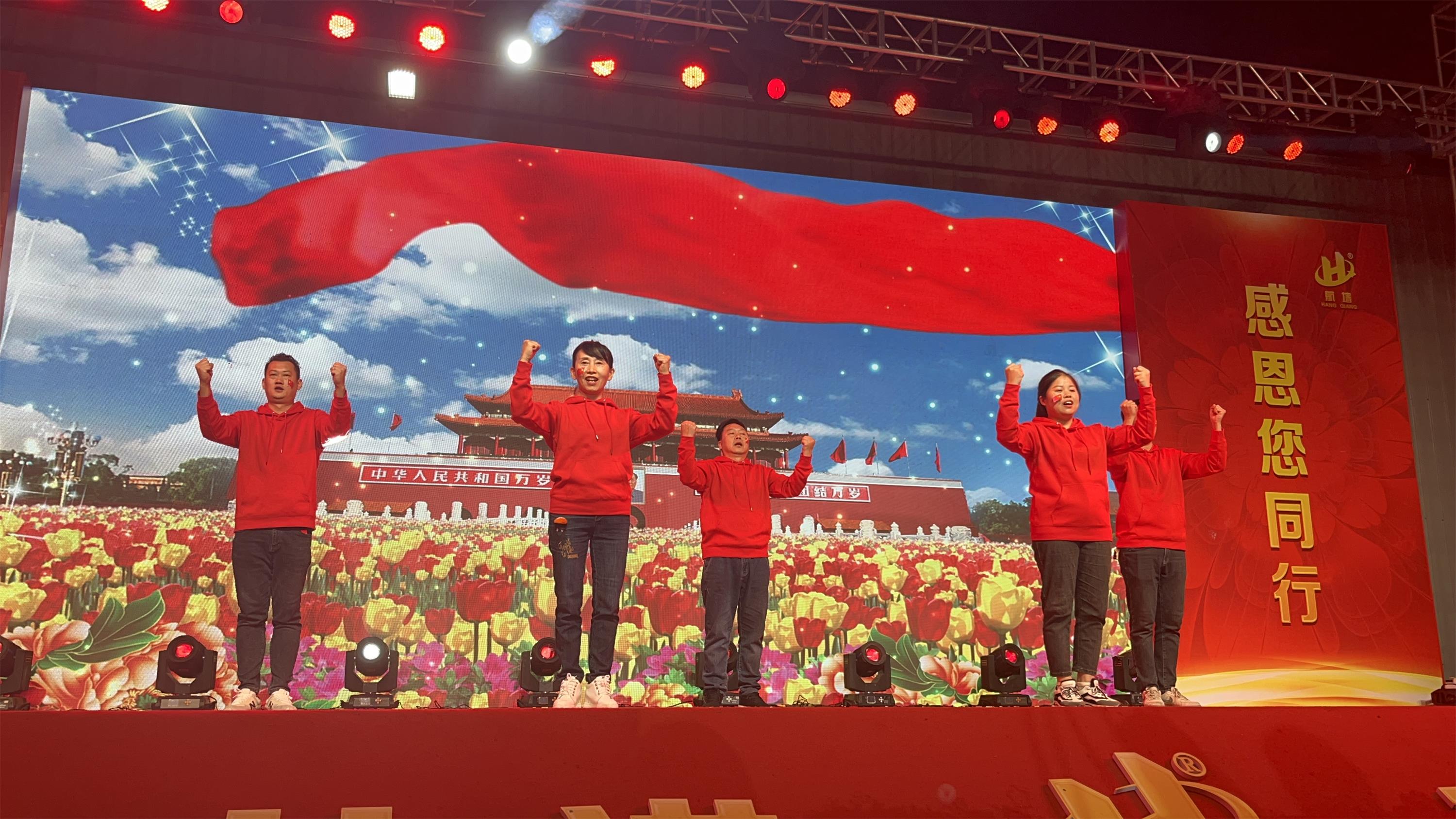 當(dāng)響起《歌唱祖國》的音樂時(shí),全場所有人員一起放聲高歌和舞臺上員工聲情并茂的表演,充分表達(dá)了航墻人對祖國的熱愛。