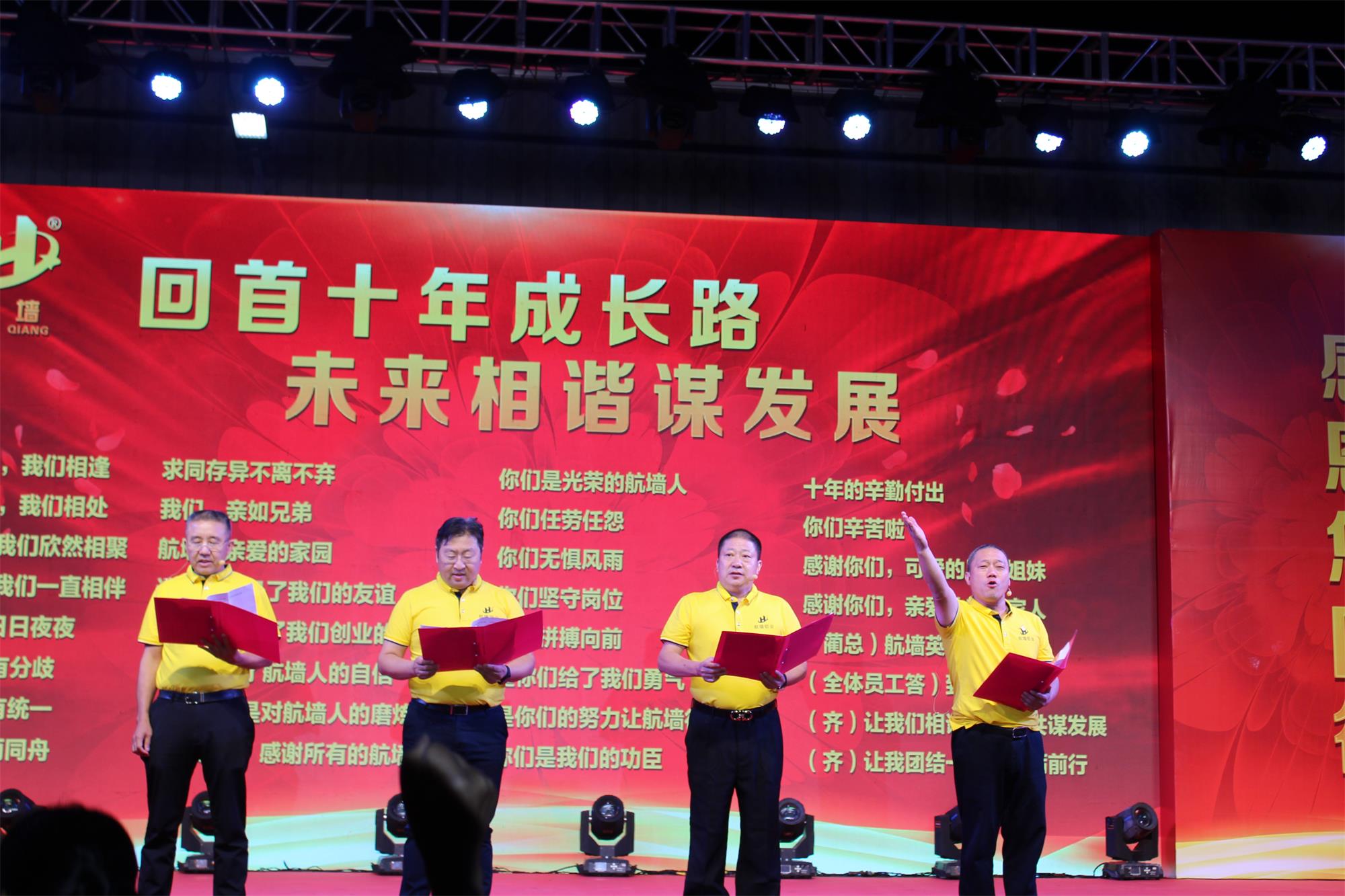 公司董事長和高管的詩朗誦《十年成長路 感恩您同行》,耐人尋味。“十年 我們一起奮進(jìn),十年 我們負(fù)重起航, 十年 我們風(fēng)雨同舟,十年 我們一直在筑夢的路上!我記得:在雜草叢中披星戴月自建廠房;我記得:動工初期一切從零開始的迷茫;我記得:簡陋的辦公室就是公司最初的戰(zhàn)場;我記得:推銷產(chǎn)品、尋找客戶穿梭在大街小巷。”這是公司成長旅途上的真實(shí)寫照。“我們期待,航墻不斷發(fā)展;我們期待,航墻永創(chuàng)輝煌;我們期待,航墻的旗幟,在綦江、 在重慶、 在全國、 在世界、 迎 風(fēng) 飄 揚(yáng)!”吶喊出了航墻人對未來的憧憬和希望,更是董事長誓將公司發(fā)展壯大的信心和決心。