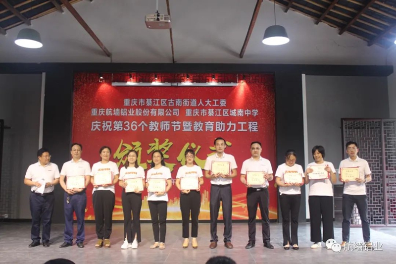 教育助力 航墻給力 2020年9月10日,重慶航墻鋁業股份有限公司董事長藺勇帶上溫馨的祝福,帶上濃濃的關懷,參加了重慶市綦江區城南中學舉行“慶祝第36個教師節暨教育助力工程頒獎儀式”。 公司董事長藺勇、總經理助理毛友銀出席頒獎儀式 城南中學學生風采展示 城南中學學生 全體老師重溫“教師誓詞&rdquo